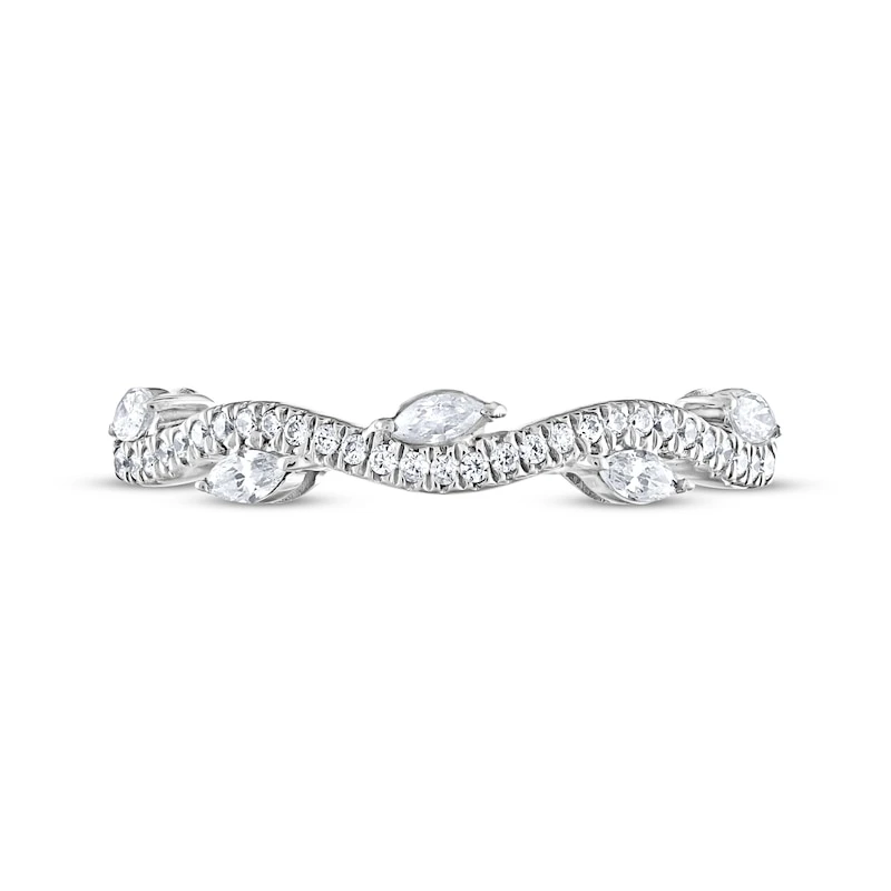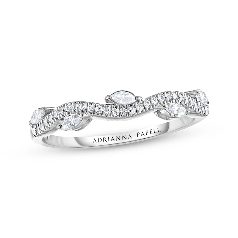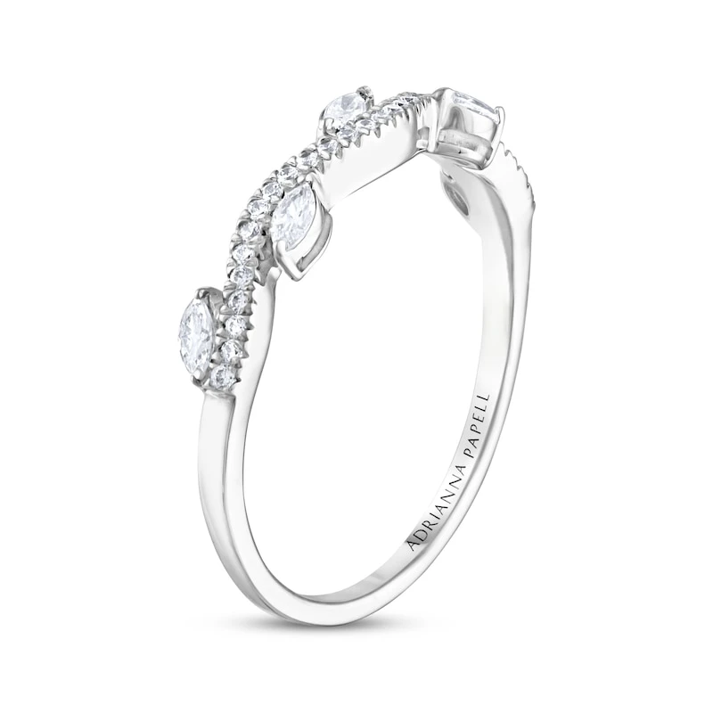 For a love as resplendent as yours, celebrate with this spellbinding diamond anniversary band for her. Crafted in 14K white gold, the delicately curved band shows true beauty with its sparkling round diamonds gracing the surface and marquise-cut diamonds to detail. The marquise-cut diamonds gently adorn the outside of the band on both sides, creating a feminine and romantic look to add to her finger stack. The ring has a total diamond weight of 1/3 carat. From the Adrianna Papell collection.