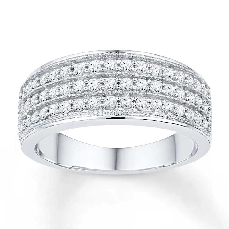 Three rows of brilliant round diamonds are the highlight of this breathtaking anniversary band for her. Milgrain detailing adds a vintage flair. The ring is styled in 10K white gold and has a total diamond weight of 1/2 carat.