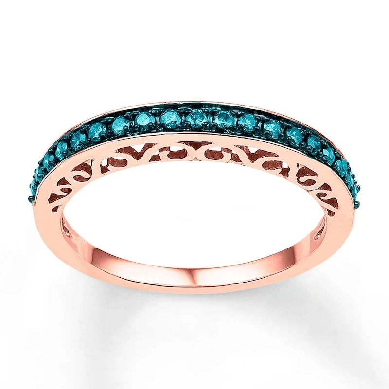 Styled in 10K rose gold, this band for her dazzles with a line of round blue diamonds. The ring features a lovely swirl pattern along the profile, and has a total diamond weight of 1/4 carat.