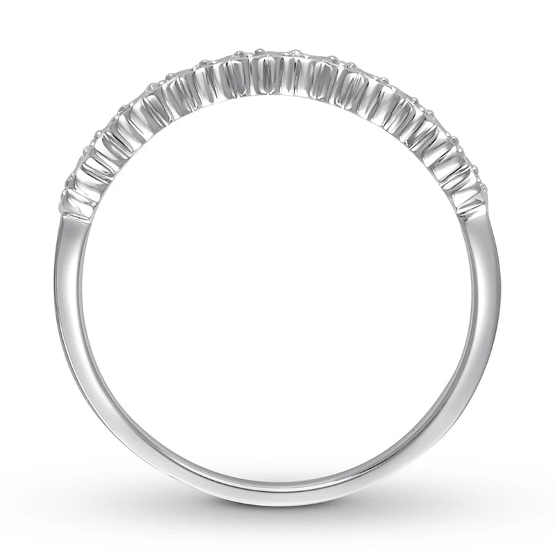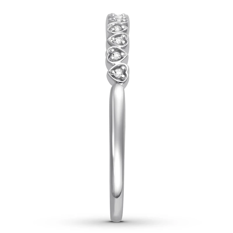 Glittering round diamonds and 14K white gold hearts make this anniversary band for her a romantic declaration of love. The ring has a total diamond weight of 1/20 carat.