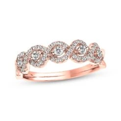 This gorgeous anniversary band for her displays five round diamonds wrapped in sparkling twists of diamonds. The 14K rose gold ring has a total diamond weight of 1/3 carat.