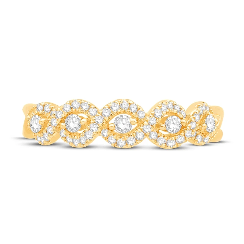 This lovely anniversary band showcases a row of round diamonds enveloped by twists of shimmering diamonds. The 14K yellow gold ring has a total diamond weight of 1/3 carat. From the Now & Forever® Bridal Collection.