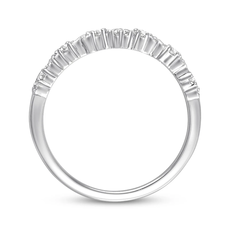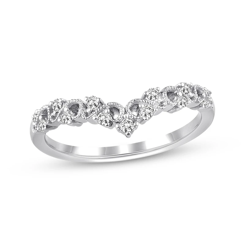 This stunning anniversary band effortlessly combines vintage and modern styles. The chevron-shaped band showcases intricate milgrain curls studded with sparkling round diamonds. Fashioned in 14K white gold, the ring has a total diamond weight of 1/6 carat.