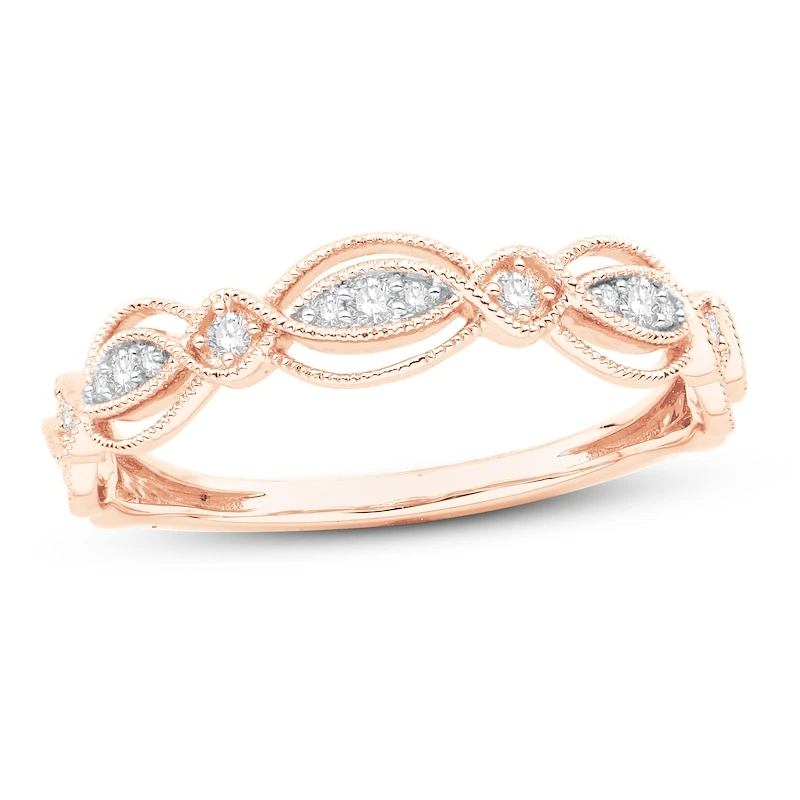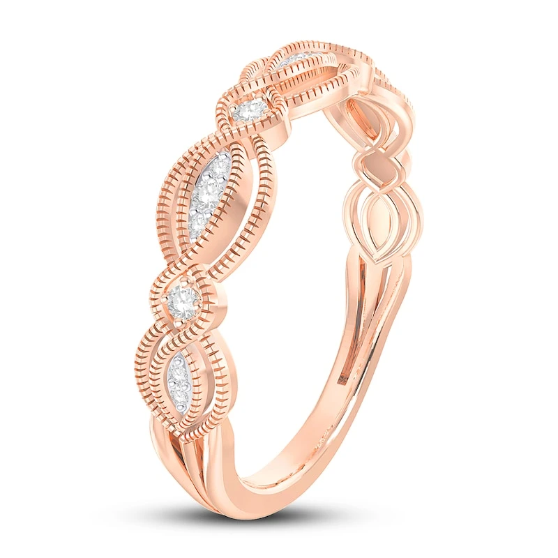 This gorgeous diamond anniversary ring for her features a mesmerizing design set in beautiful 10K rose gold. Brilliant round-cut diamonds embellish the band for a total diamond weight of 1/10 carat. From the Now & Forever® bridal collection.