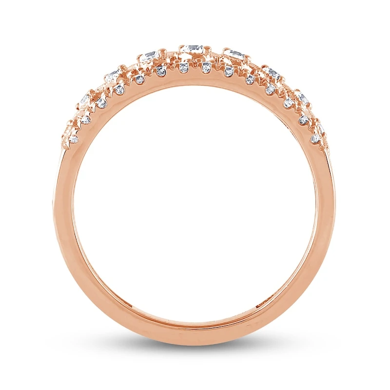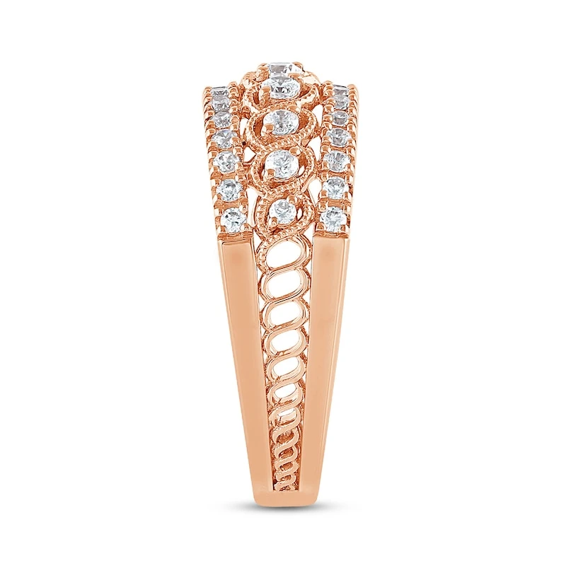 Three rows of brilliant round-cut diamonds sparkle across this dreamy anniversary ring for her. Set in romantic 10K rose gold, classic milgrain detailing sweeps throughout to finish the look. The ring has a total diamond weight of 1/2 carat. From the Now & Forever® bridal collection.