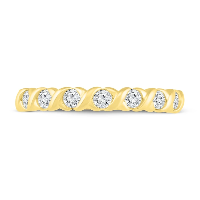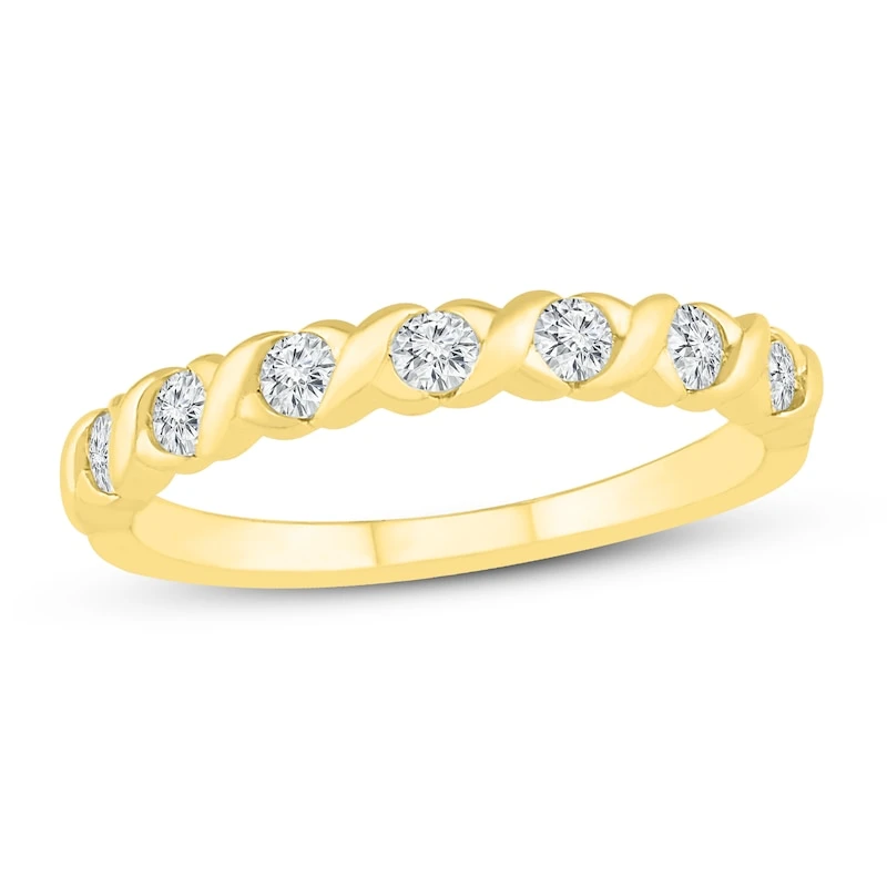 This stunning diamond anniversary ring for her features an alternating design comprised of sparkling round-cut diamonds and 10K yellow gold. The ring is fashioned in 10K yellow gold and has a total diamond weight of 1/3 carat. From the Now & Forever® bridal collection.