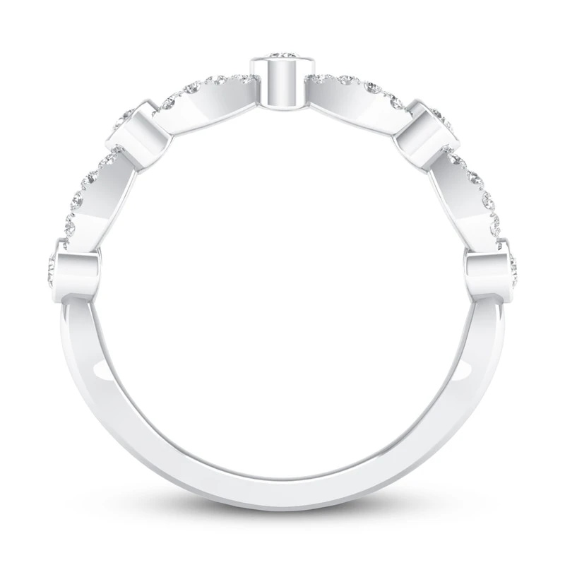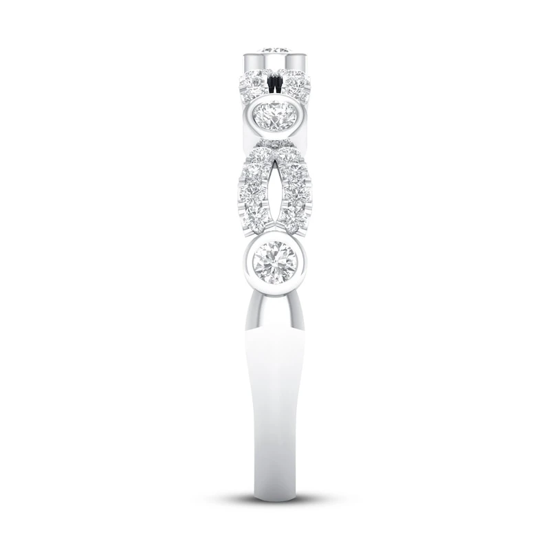 Memorable and glamorous, this eye-catching anniversary ring is a beautiful token of your love. The sparkling round diamonds detail the 10K white gold band in a twisting fashion. The total diamond weight is 1/4 carat.