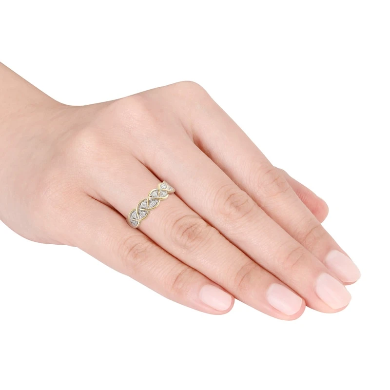 Braided strands of 10K yellow gold weave around sparkling diamonds in this stunning anniversary ring for her. The ring totals 1/4 carat in diamonds.
