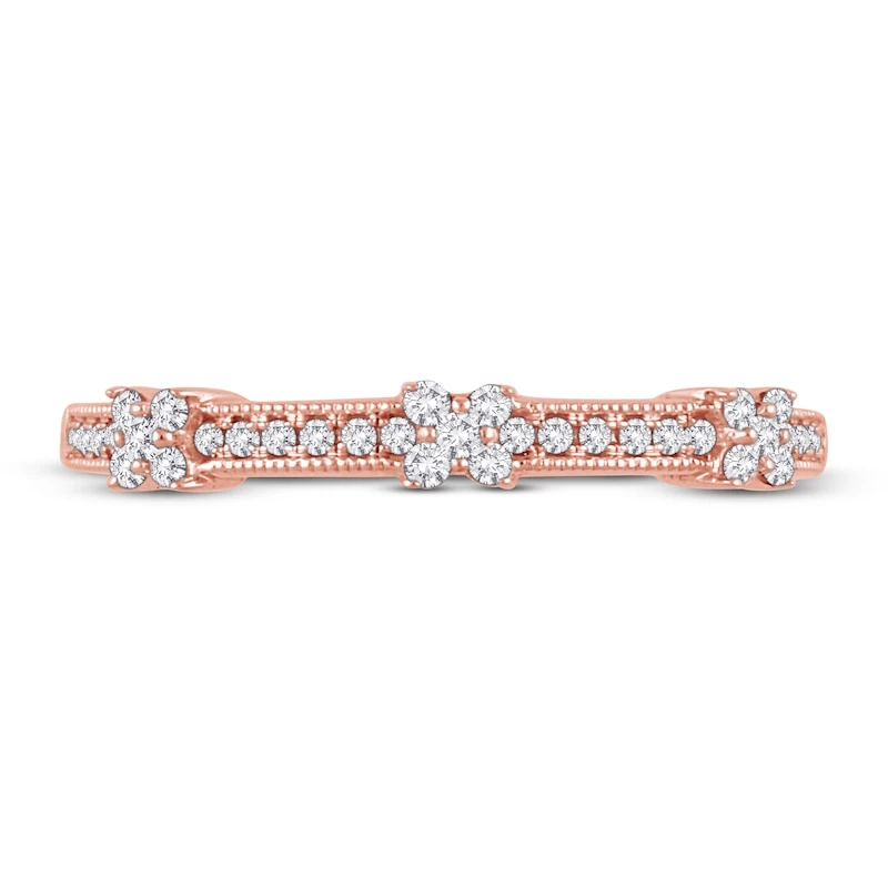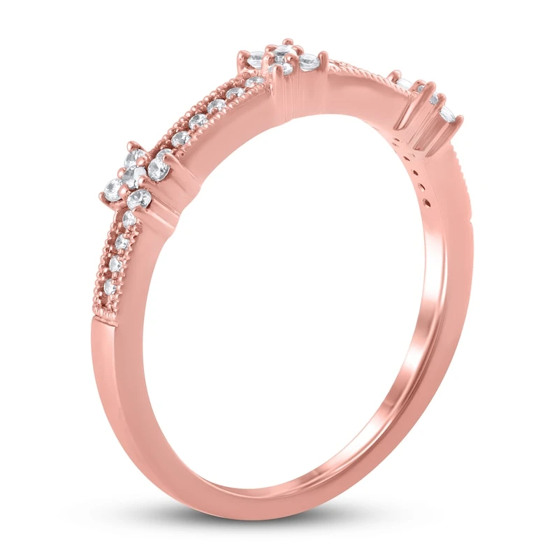 This romantic anniversary ring for her is destined to be an incomparable addition to her wedding stack. Crafted from 10K rose gold this ring features round diamonds placed thoughtfully throughout to create three floral-inspired shapes. The total diamond weight is 1/6 carat. From the Now & Forever® Bridal Collection.