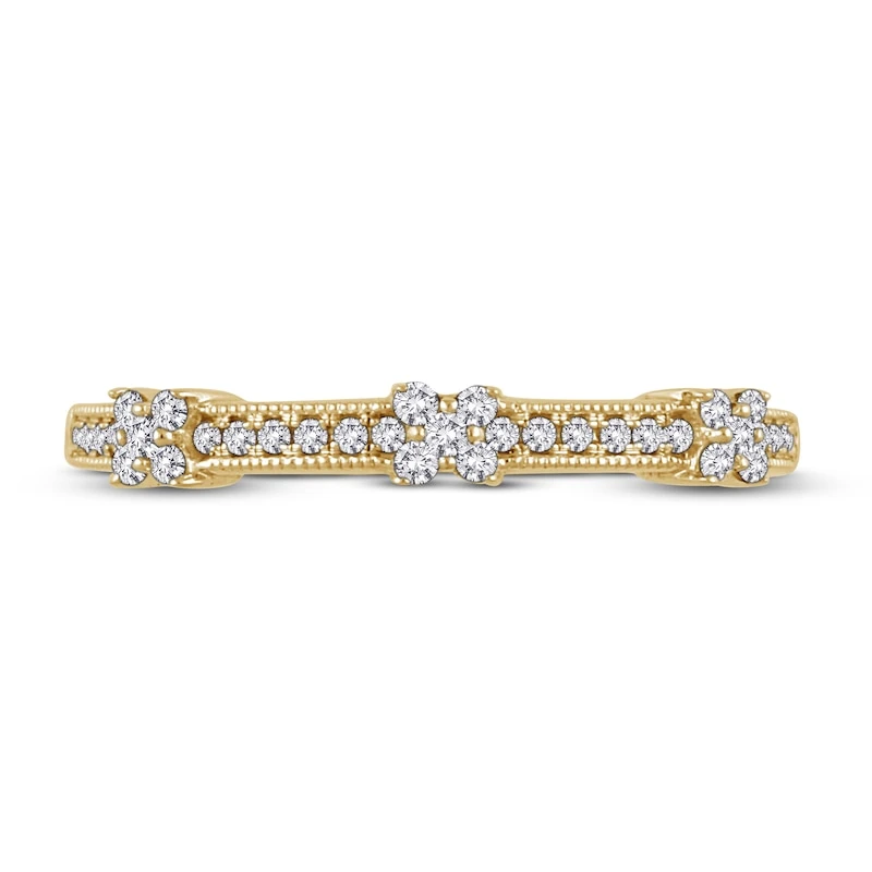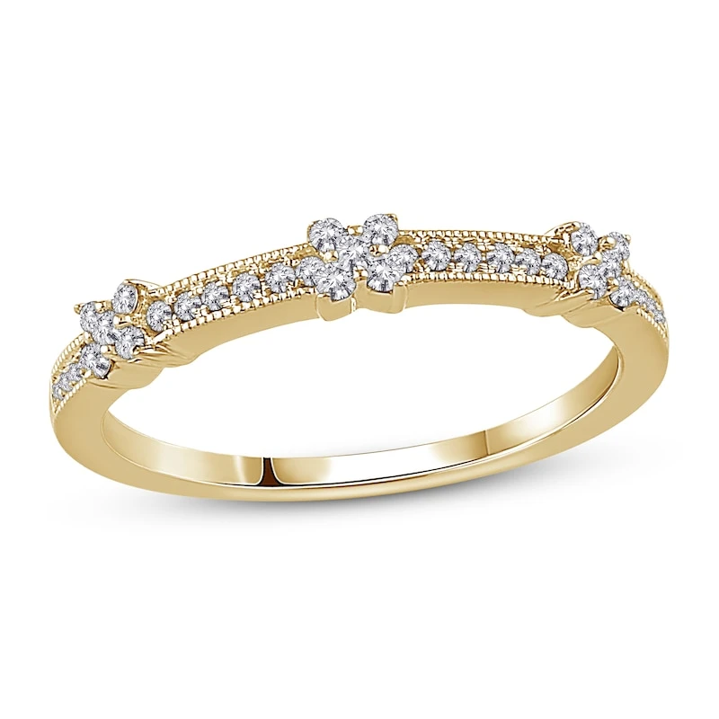 This beautiful anniversary ring for her is destined to be the perfect addition to her wedding stack. Crafted from 10K yellow gold this ring features round diamonds placed thoughtfully throughout to create three floral-inspired shapes. The total diamond weight is 1/6 carat. From the Now & Forever® Bridal Collection.