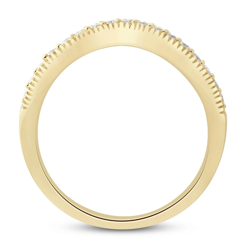 This gorgeous diamond contour band for her is designed to give her engagement ring (sold separately) extra sparkle. Fashioned in 14K yellow gold, the band features a contoured design embellished with sparkling round diamonds. The total diamond weight is 1/5 carat. From the Now & Forever® bridal collection.