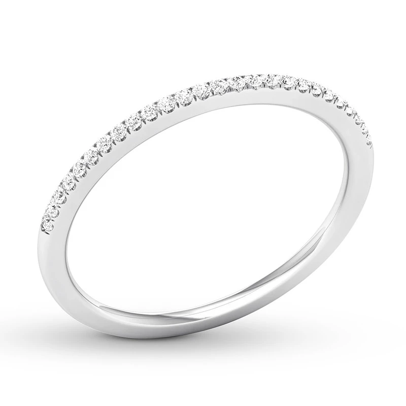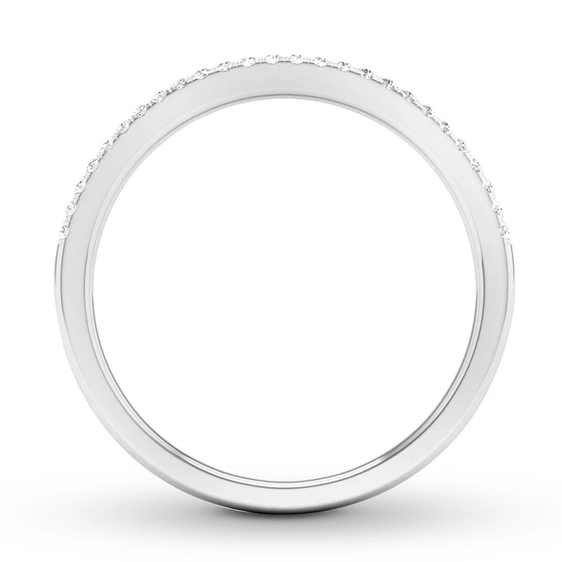 This lovely wedding band celebrates your love with a shimmering line of round diamonds set in the 10K white gold band. The ring has a total diamond weight of 1/10 carat.