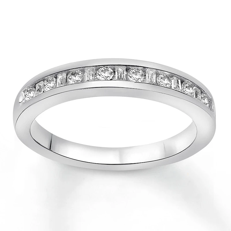 Round and baguette diamonds are channel-set in the polished 14K white gold band of this gorgeous wedding band. The ring has a total diamond weight of 1/3 carat and is designed to fit alongside her matching engagement ring (sold separately).