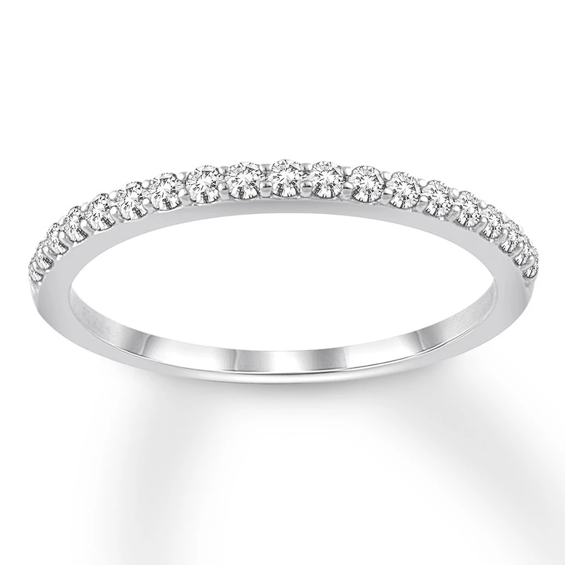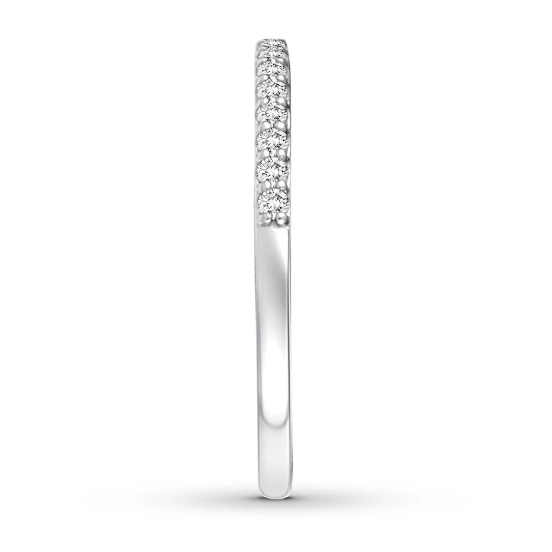 Fashioned in polished 14K white gold, this lovely wedding band for her gleams with round diamonds totaling 1/4 carat in weight.