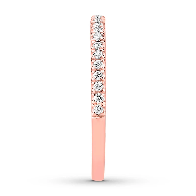 This diamond wedding band in 10K rose gold is the perfect accompaniment to the matching engagement ring (sold separately). The band has a total diamond weight of 1/6 carat.