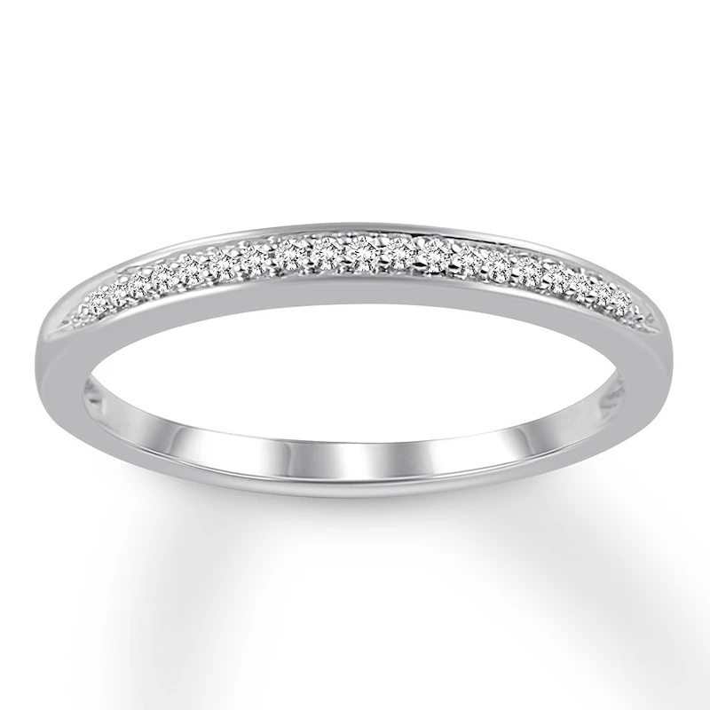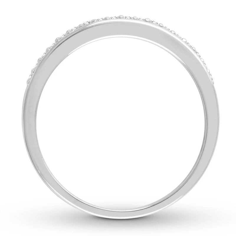 This pretty wedding band for her sparkles with round diamonds totaling 1/8 carat in weight. The ring is styled in 10K white gold.