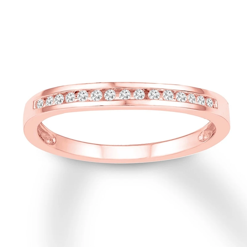 You have the ring for “yes,” so now it’s time to find the ring for “I do.” This lovely wedding band adds sparkle to her matching engagement ring (sold separately) with a row of channel-set round diamonds totaling 1/8 carat in weight. The band is styled in romantic 10K rose gold.