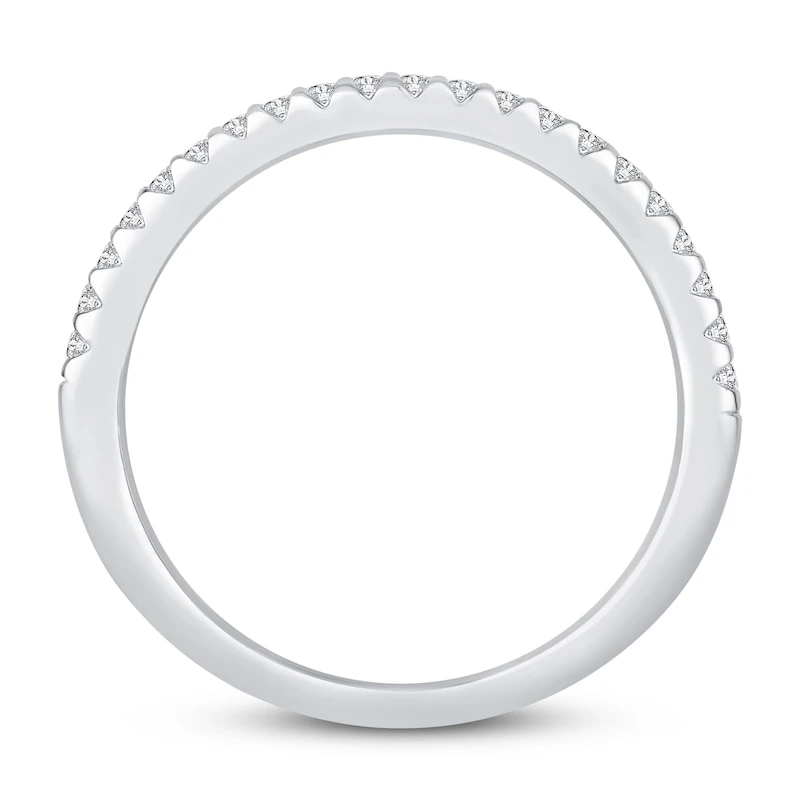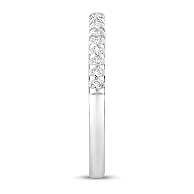 A lovely wedding band for her, this ring features glowing round diamonds that adorn the surface of the striking 14K white gold band. Dazzling and contemporary, the ring has a total diamond weight of 1/5 carat.