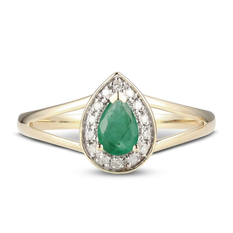 This vintage-inspired ring from Natural Precious Gemstones by KAY showcases a sumptuous pear-shaped emerald surrounded by radiant round diamonds. Fashioned in gleaming 10K yellow gold, the ring features an elegant split-shank band and has a total diamond weight of 1/20 carat.