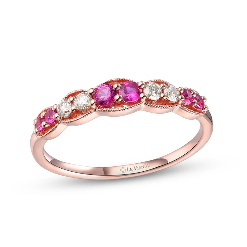 This exquisite ring by Le Vian® is designed to mix, match and stack and features Passion Rubyâ„¢ pairs layered amidst Nude Diamondsâ„¢. Crafted in succulent 14K Strawberry Gold®, the ring has a total diamond weight of 1/6 carat. Le Vian®. Discover the Legend. This ring is available in limited sizes. If you don’t see your size here, please visit a store to order your ring.