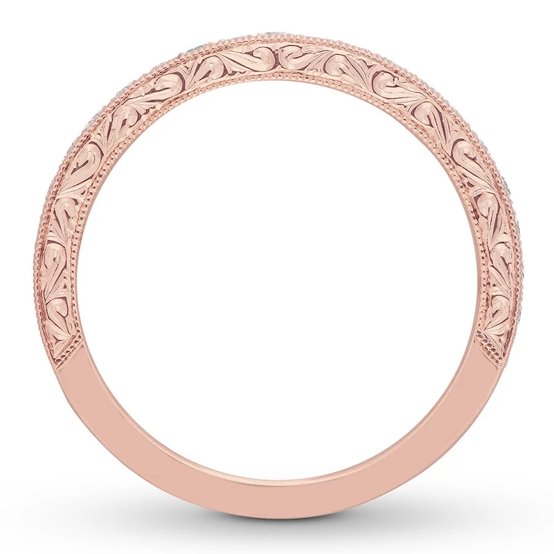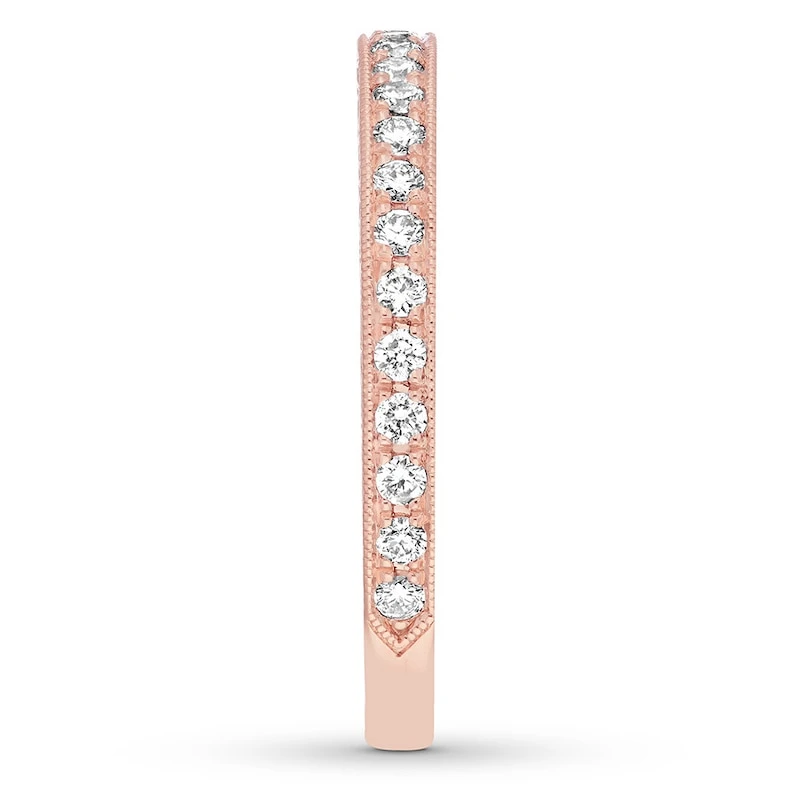 Shimmering diamonds and milgrain detailing adorn this glamorous wedding band from Neil Lane Bridal®, styled in 14K rose gold. Vintage-inspired intricate designs decorate the profile. The ring has a total diamond weight of 1/3 carat. The ring is styled to complement the matching engagement ring (sold separately).