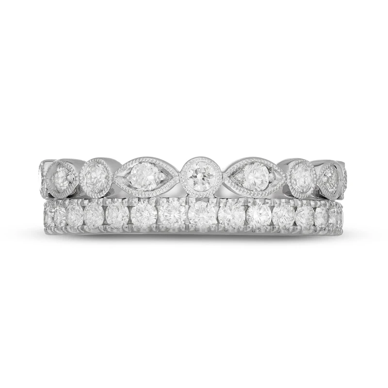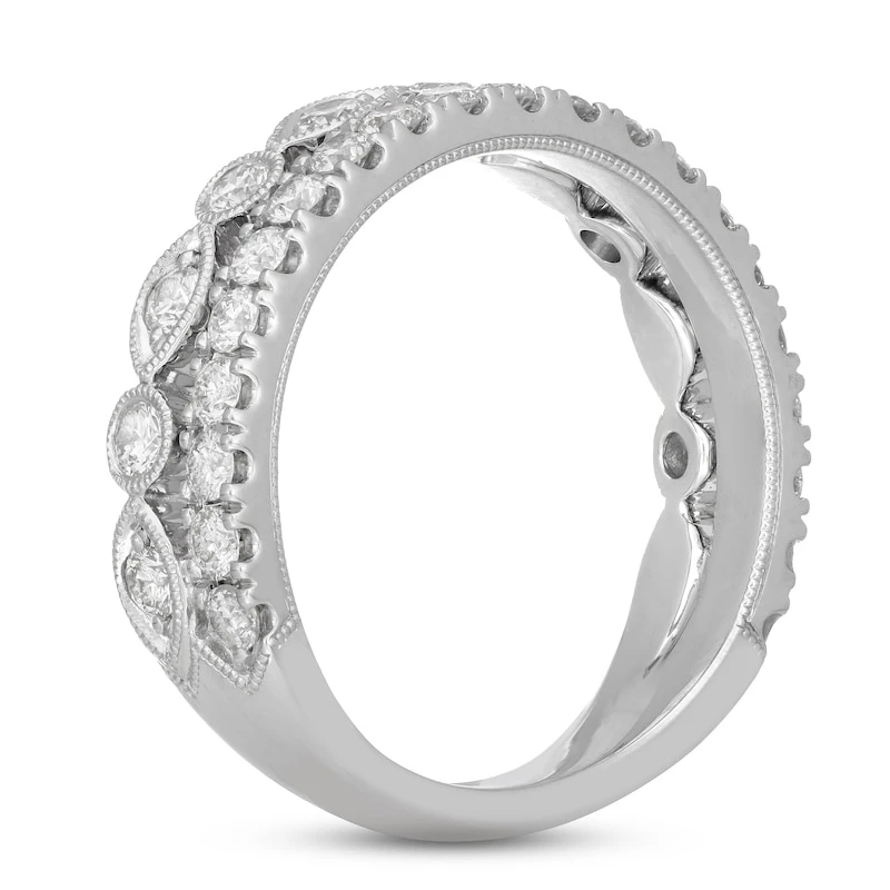 Radiant round diamonds shimmer along this lovely anniversary band for her. Classic milgrain accents adorn the 14K white gold band, which has a total diamond weight of 1 carat. From the Neil Lane® Bridal collection.
