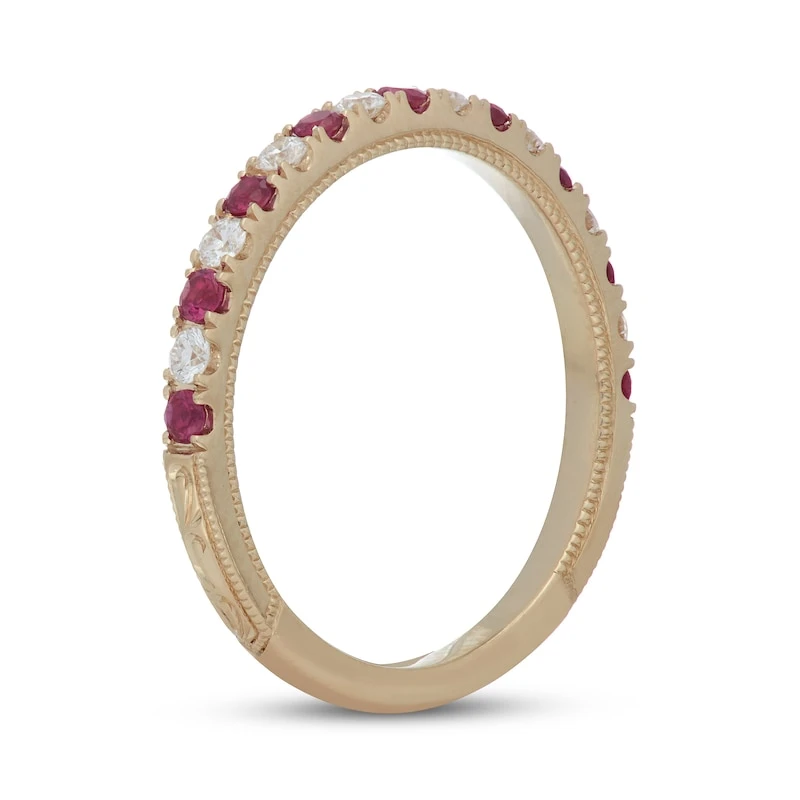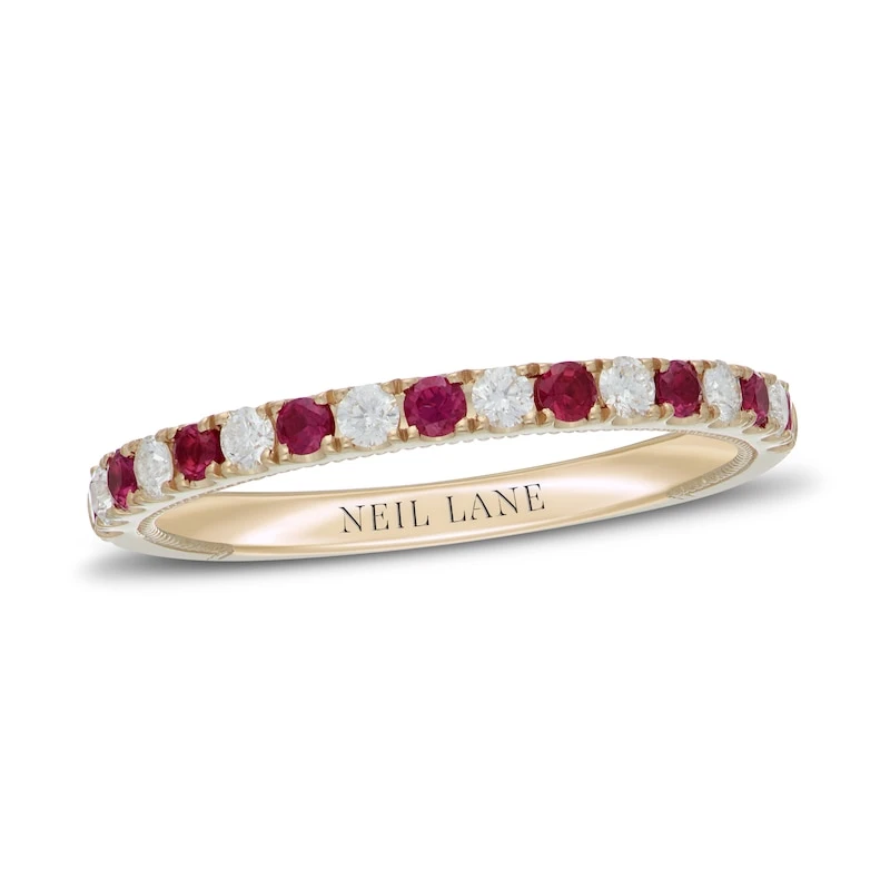 This gorgeous and elegant anniversary ring for her features a row of alternating round-cut diamonds and radiant round rubies set in timeless 14K yellow gold. The ring has a total diamond weight of 1/5 carat and is finished with classic milgrain detailing. From the Neil Lane Bridal® collection.
