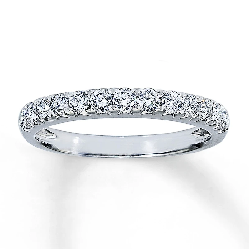 Featuring a row of round diamonds, this elegant 14K white gold ring is the ideal complement to your fine jewelry ensemble. This anniversary ring has a total diamond weight of 1/2 carat. Available online while supplies last. Previously Owned Treasures are not eligible for in-store pickup. Previously Owned Treasures may only be shipped either to your home address or to an alternate address. Price comparison based on new item pricing.