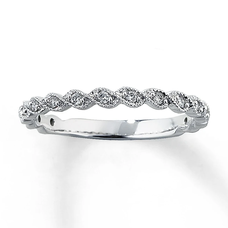 Diamonds dance along milgrain-edged twists in this lovely vintage anniversary ring for her. Styled in 14K white gold, this fine jewelry ring has a total diamond weight of 1/8 carat. Available online while supplies last. Previously Owned Treasures are not eligible for in-store pickup. Previously Owned Treasures may only be shipped either to your home address or to an alternate address. Price comparison based on new item pricing.
