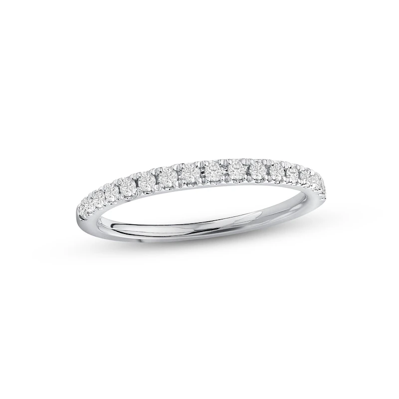 Sparkling round diamonds dance along this classic 10K white gold band for her. Ideal for an anniversary or wedding band, the ring has a total diamond weight of 1/4 carat. Available online while supplies last. Previously Owned Treasures are not eligible for in-store pick-up. Previously Owned Treasures may only be shipped either to your home address or to an alternate address. Price comparison based on new item pricing.