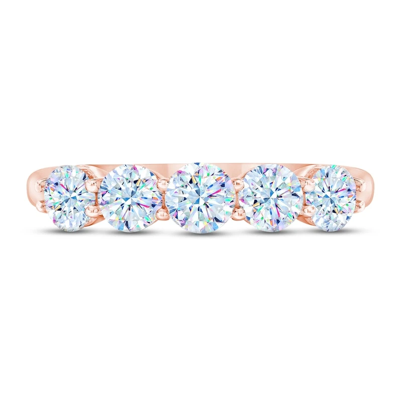 This alluring anniversary ring for her displays five stunning First Light® diamonds styled in romantic 14K rose gold. From Leo Schachter, the independently-certified diamonds feature Fire Prism™ technology that creates infinite flashes of color for more fire and sparkle. The ring has a total diamond weight of 1 1/2 carats.